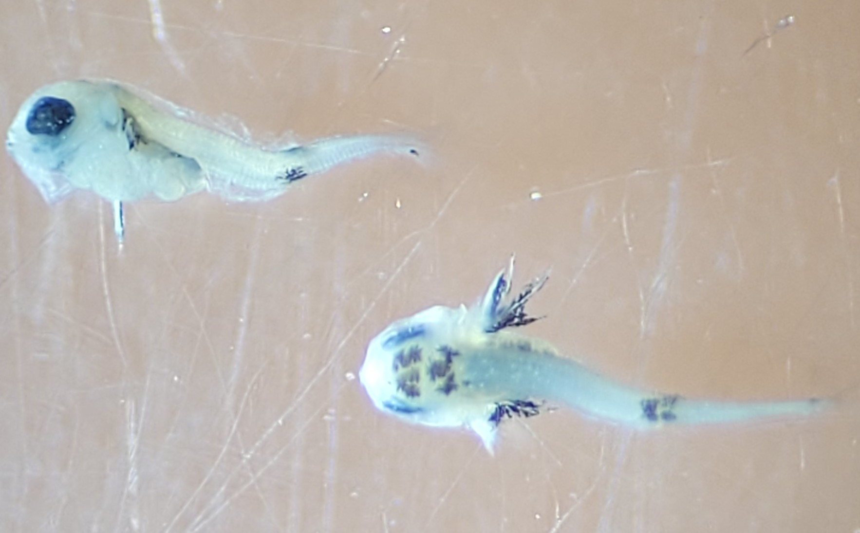 The interesting thing is that these fun features are not what we think of in the lab when we picture a Fourbeard Rockling larva. Instead, we look to see if they lack prominent pelvic fins (they hatch without them, though they develop quickly), have a head-bobbin, or if they have (or lack) any fin rays at all. The features that are iconic in the larvae (a black band and a neat little tail dot) don’t even exist in the adult! Until they reach their juvenile stage, most fish look nothing like what they’ll grow up to be, and the Fourbeard Rockling is no exception. But to us, this nifty little fish is still exceptional!